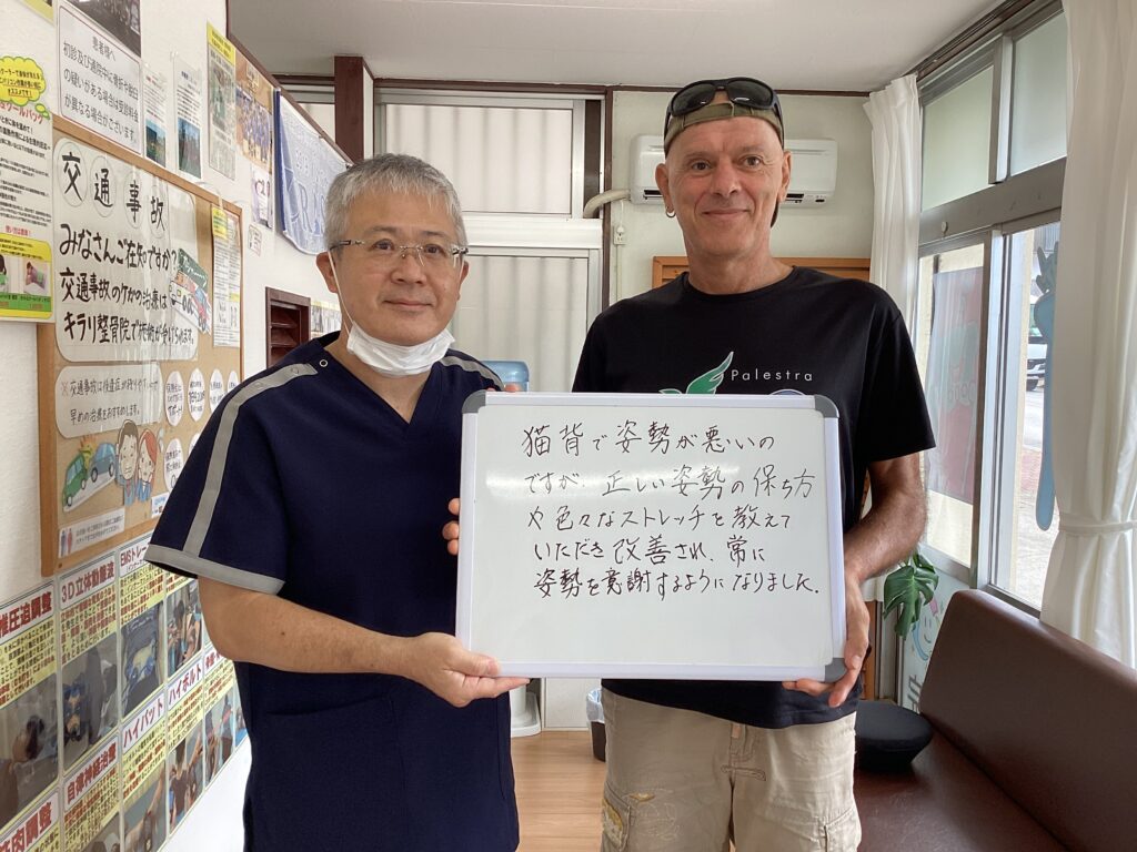 | 症例 | 奥様が日本人で来沖され3か月ほどの沖縄滞在のイタリア在住のP.M様。日頃から首や背中、腰にかけて痛みや違和感があり滞在中、痛みを軽減させたいとの事でご来院されました。 お身体をチェックすると姿勢が悪く筋肉の緊張があり、お身体を手技に緩め、深部の筋肉をプロアスリートやオリンピック代表選手にも利用されている伊藤超短波製EMS(電気治療)を行い、痛みが緩和され姿勢も改善してきました。 ご本人いわくイタリアに戻っても姿勢が戻らないように筋トレやストレッチを習慣化したいとのことでした。 |